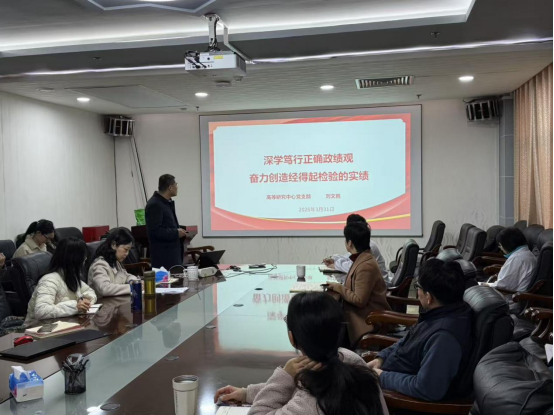 2026年3月31日,高等研究中心开展主题党日活动,刘文胜书记给全体党员上了《深学笃行正确政绩观,奋力创造经得起检验的实绩》的党课,科级以下干部和全体党员观看视频资料:《“十五五”时期经济社会发展的指导思想、重大原则和根本保证》,并开展了交流讨论。会上,还开展了实验室安全环保方面的学习和教育,并对中心“十五五”规划编制工作进行了讨论。